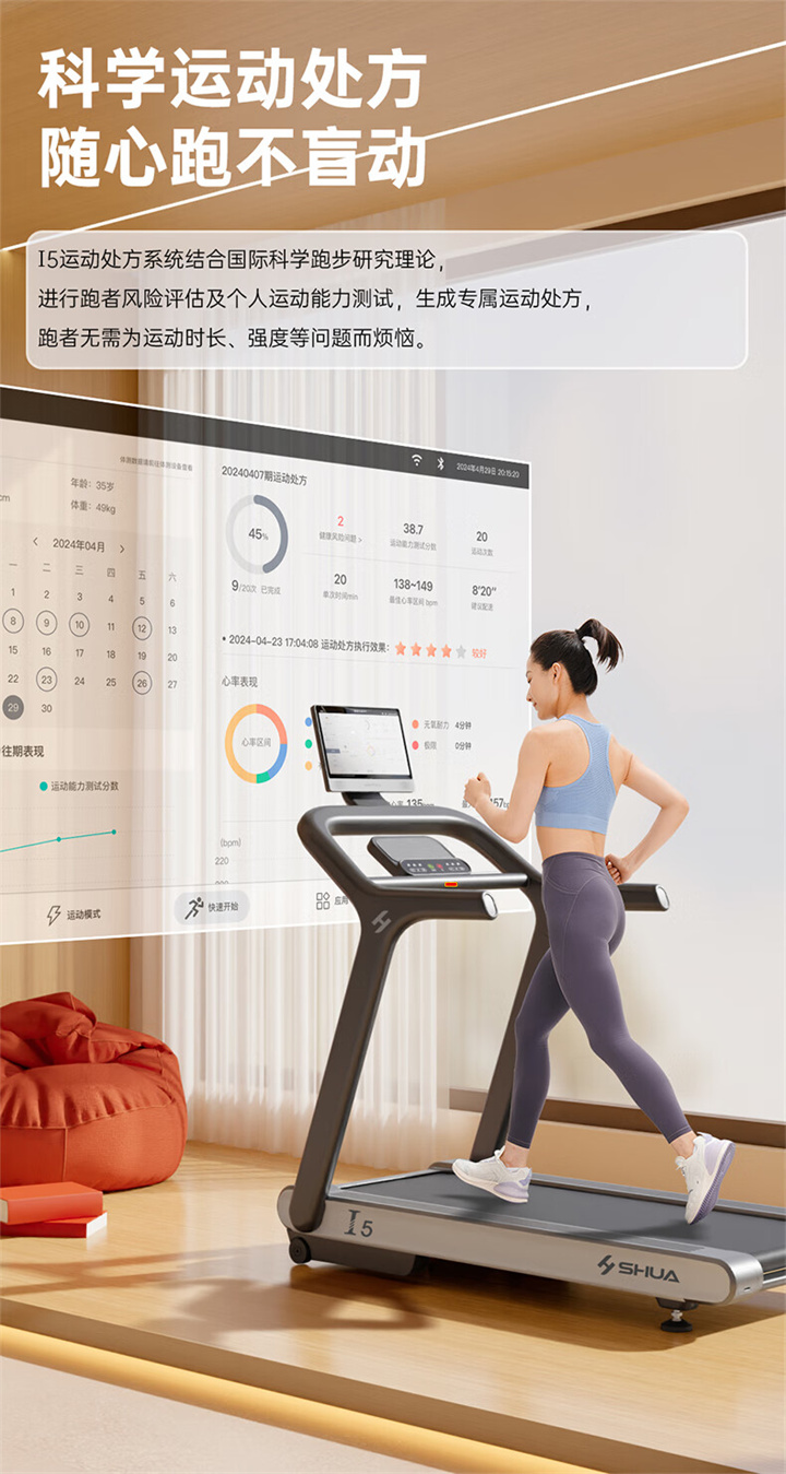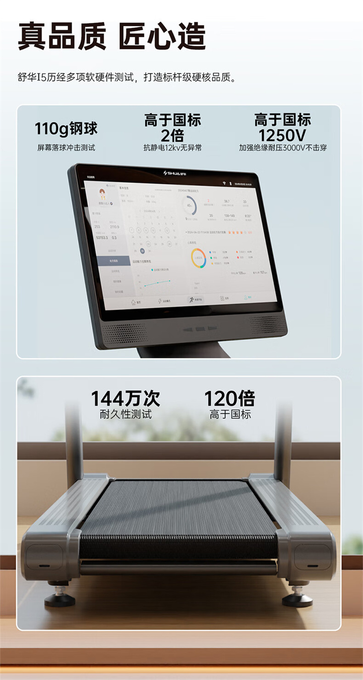 舒華X5 Pro豪華智能跑步機采用全新舒華跑步機系統,搭載21.5寸大屏,內置九種運動程序,包括場景跑、在線約跑和一鍵體育考試等內容,亦有教練在線科學指導和比賽互動,可在線升級,歷經耐久性測試,讓您使用更安全,雙跑臺設計,全減震系統,核心動力采用F級耐高溫馬達,5.0HP峰值馬力,提供源源動力,讓您享受每一次暢跑體驗。