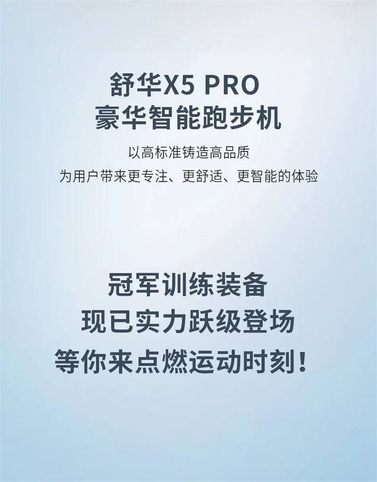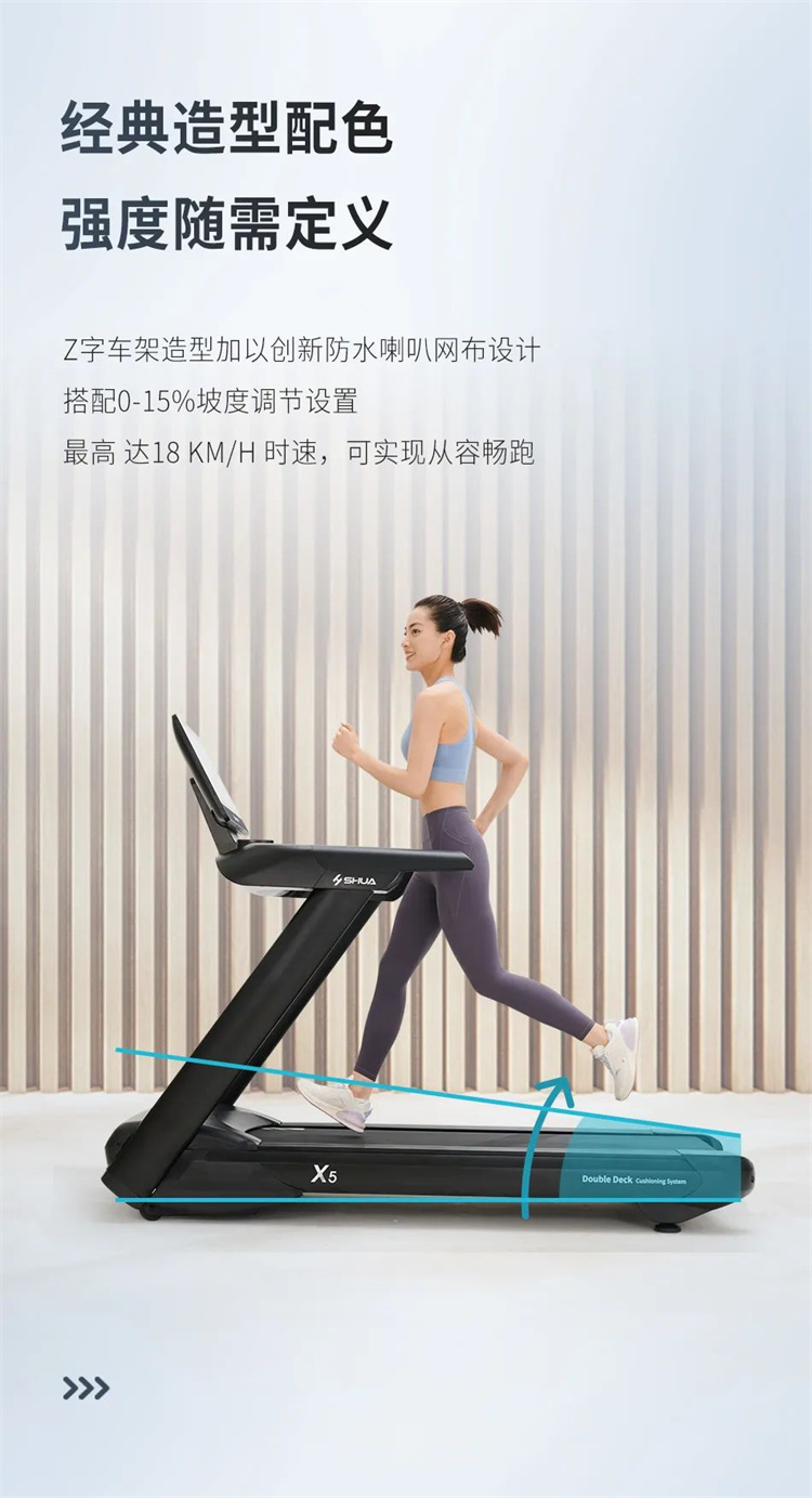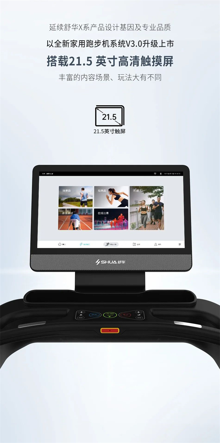 舒華X5 Pro豪華智能跑步機采用全新舒華跑步機系統,搭載21.5寸大屏,內置九種運動程序,包括場景跑、在線約跑和一鍵體育考試等內容,亦有教練在線科學指導和比賽互動,可在線升級,歷經耐久性測試,讓您使用更安全,雙跑臺設計,全減震系統,核心動力采用F級耐高溫馬達,5.0HP峰值馬力,提供源源動力,讓您享受每一次暢跑體驗。